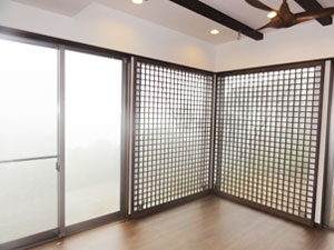 | ペットの脱走防止に 網戸の内側に木製の格子を設置 インテリアにも最適のデザインで 実用性も両立 |