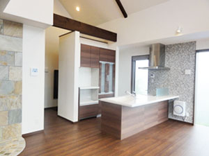 キッチン廻りはタイル張りで シックな雰囲気を演出 凹凸のないフラットなキッチンなので 使い勝手も抜群 |